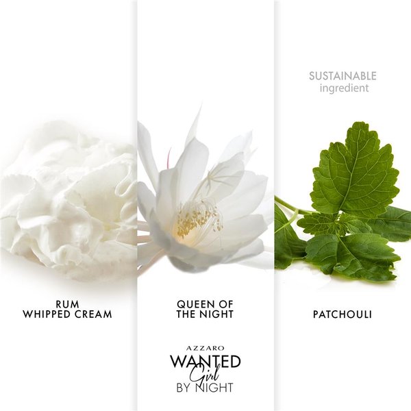 L'Eau de Parfum pour femme Azzaro Wanted Girl By Night est une composition « florale orientale gourmande » à la floralité audacieuse révélée par des ingrédients gourmands :