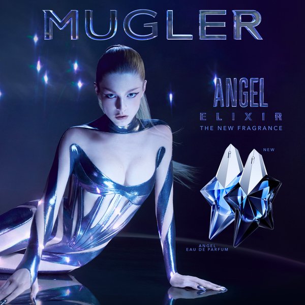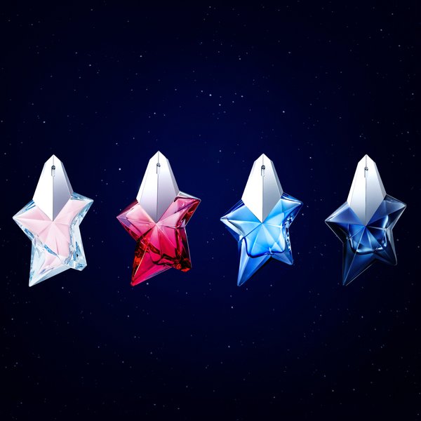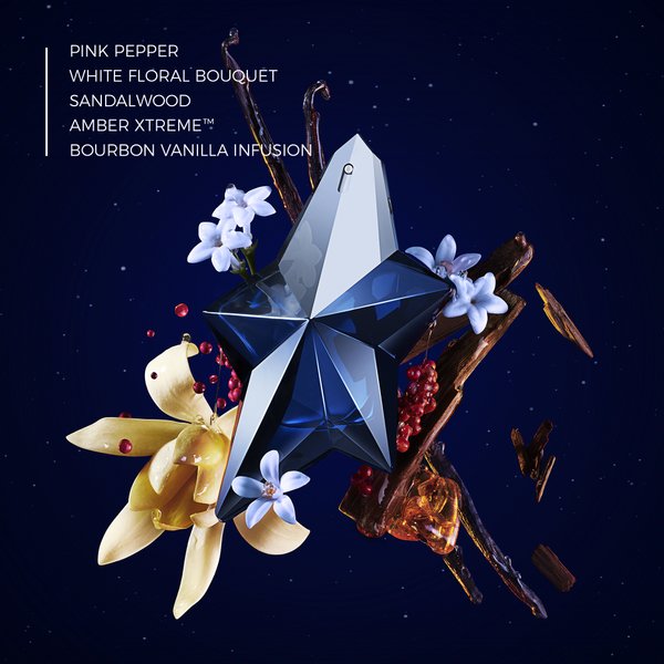 Imaginez une voie lactée florale capturée dans le flacon en forme d'étoile emblématique de Mugler, transformée en un bleu profond captivant...