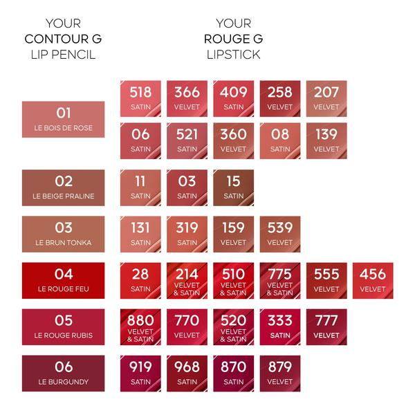 Contour G se décline en six teintes, conçues pour mettre en valeur les tonalités originelles de toutes les lèvres et s’associer à la perfection aux rouges à lèvres de la Maison Guerlain :