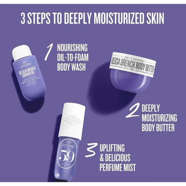 Glycerin, Aqua (Water, Eau), Cocamidopropyl Betaine, Disodium Cocoamphodiacetate, Parfum (Fragrance), Lactobacillus/Hibiscus Sabdariffa Flower Ferment Filtrate (Prebiotic Hibiscus), Platonia Insignis (Bacuri) Seed Butter, Copaifera Officinalis (Balsam Copaiba) Resin*, Passiflora Edulis (Passionflower) Seed Oil*, Bertholletia Excelsa (Brazil Nut) Seed Oil, Cocos Nucifera (Coconut) Oil, Euterpe Oleracea (Açaí) Fruit Oil, Helianthus Annuus (Sunflower) Seed Oil, Gardenia Jasminoides (Gardenia) Fruit Extract, Carapa Guaianensis (Andiroba) Seed Oil, Phenoxyethanol, Sodium Chloride, Polyquaternium-10, Citric Acid, Hydroxyethylcellulose, Ethylhexylglycerin, Tetrasodium Glutamate Diacetate, Maltodextrin, Sodium Hydroxide, Butylene Glycol, Tocopherol, Alpha-Isomethyl Ionone, Hydroxycitronellal. *Brazilian Soothing Complex Delícia Drench™ Body Butter: Aqua (Water, Eau), Butyrospermum Parkii (Shea) Butter, Cocos Nucifera (Coconut) Oil, Ethylhexyl Palmitate, Parfum (Fragrance), Methyl Glucose Sesquistearate, Glyceryl Stearate SE, Lauryl Laurate, Glycerin, Myristyl Myristate, Hydrolyzed Sodium Hyaluronate (Hyaluronic Acid), Lactobacillus/Hibiscus Sabdariffa Flower Ferment Filtrate (Prebiotic Hibiscus), Copaifera Officinalis (Balsam Copaiba) Resin*, Passiflora Edulis (Passionflower) Seed Oil*, Platonia Insignis (Bacuri) Seed Butter, Theobroma Grandiflorum (Cupuaçu) Seed Butter, Squalane, Tocopherol, Bixa Orellana (Achiote) Seed Extract, Cetearyl Alcohol, Behenyl Alcohol, Caprylic/Capric Triglyceride, Phenyl Trimethicone, Maltodextrin, Cetearyl Olivate, Sorbitan Olivate, Sodium Stearoyl Glutamate, Potassium Cetyl Phosphate, Sodium Gluconate, Ethylhexylglycerin, Phenoxyethanol, Butylene Glycol, Carbomer, Potassium Hydroxide, Sodium Hydroxide, Annatto (CI 75120), Alpha-Isomethyl Ionone, Hydroxycitronellal. *Brazilian Soothing Complex Cheirosa 59 Delícia Drench™ Perfume Mist: Alcohol Denat., Aqua (Water, Eau), Parfum (Fragrance), Alpha-Isomethyl Ionone, Hydroxycitronellal. |