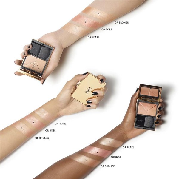 Il est disponible en 3 teintes lumineuses. Grâce à la technologie innovante YSL, sa texture ultrafine et fondante, concentrée en fort taux de pigments illuminateurs le Couture Blush Highlighter fusionne avec la peau sans surcharge.