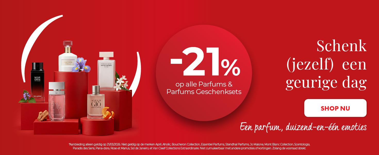 Op 21 maart vieren we de Dag van het Parfum! Profiteer voor deze gelegenheid van een uitzonderlijke korting van -21% op alle parfums en geschenksets. Het is het perfecte moment om nieuwe geuren te ontdekken of je favoriete parfum aan een zachte prijs terug te vinden. Laat je zintuigen spreken en verwen jezelf met geuren die bij je passen.