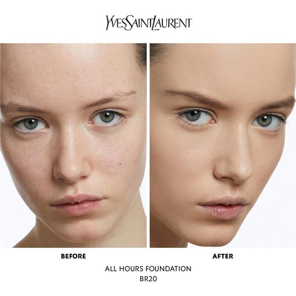De perfectie met All Hours. Bereid u voor op eindeloze dagen en nachten met Encre de Peau All Hours, de 1ste dekkende foundation voor dag en nacht van Yves Saint Laurent Beauté: speel op veilig overdag en geniet de hele nacht tot in de vroege uurtjes van een matte teint zonder onvolkomenheden. 24 uur compromisloos comfort: deze lang houdende foundation hoeft niet te worden bijgewerkt en geeft niet af. Hij is waterproof, bestand tegen warmte en blijft bovendien comfortabel aanvoelen, zelfs op een superdrukke dag. Hoge dekkingsgraad zonder maskereffect: een hoge concentratie van fijne, soepele pigmenten zorgt voor een perfecte en egale dekking die altijd natuurlijk oogt. Langdurige, gecontroleerde matte teint: deze niet-vette formule garandeert een frisse teint die niet glimt en maakt poriën de hele dag lang minder zichtbaar. Bescherming tegen externe agressie: dankzij zijn zonnebeschermingsfactor en verzorgend complex houdt deze actieve foundation de huid fris en glad. Is geschikt voor alle huidtypen, zelfs de meest gevoelige. Getest onder dermatologisch toezicht - niet-comedogeen. De foundation biedt een goede dekking: 90,4%. De foundation maakt de onvolmaaktheden minder zichtbaar (poriën, rimpels en fijne lijntjes, puistjes...) 90,4%. De huid voelt gegarandeerd comfortabel aan: 91,8%. Zelfs na een intense dag houdt de foundation nog goed: 89,0%. Zelfs na een stressy dag houdt de foundation nog goed: 91,8%. Zelfs na een avondje uit / stressy nacht houdt de foundation nog goed: 87,7%. *Panel van 73 vrouwen die de foundation 7 dagen lang hebben gebruikt.