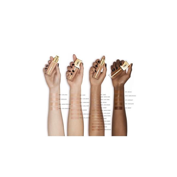 24 uur ademende dekking24 uur hydratatieNatuurlijke gezonde glow en egale huid. Yves Saint Laurent Touche Eclat Le Teint FoundationDeze vloeibare foundation biedt een 24 uur* ademende medium dekking en 24 uur hydratatie**. De formule is verrijkt met de natuurlijke ingrediënten gouds- en mallowbloemen afkomstig uit de YSL Beauty Ourika Community Gardens. Deze extracten zorgen voor een natuurlijke gezonde gloed en een egale teint. Het YSL Glowing Hydration ComplexTM met verhelderende mallowbloemextract en glycerine, geeft de huid 24 uur lang hydratatie om uitdroging en dofheid te voorkomen. Dermatologisch getest en niet-comedogeen. *Consumenten test – 102 vrouwen.**Instrumentele test – 24 vrouwen.